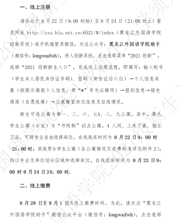 黑龙江外国语学院迎新系统及网站入口 2021新生入学须知及注意事项 2021-08-01 15:57 高考录取通知书发放后,同学们就要着手准备大学入学的相关事宜了,下面是黑龙江外国语学院新网入口及新生入学注意事项等内容,供大家查阅。黑龙江外国语学院迎新系统及网站入口点击图片,进入迎新网新生入学须知及注意事项 推荐阅读: 黑龙江2024同等学力硕士学位外语水平考试时间 几号考试 黑龙江2024上半年英语四六级报名及考试时间 几号开考 黑龙江2024年6月英语四六级报名时间公布 哪天报名 黑龙江2024上半年英语四六级考试时间 几月几号考试 黑龙江2024上半年英语四六级报名时间公布 几号报名