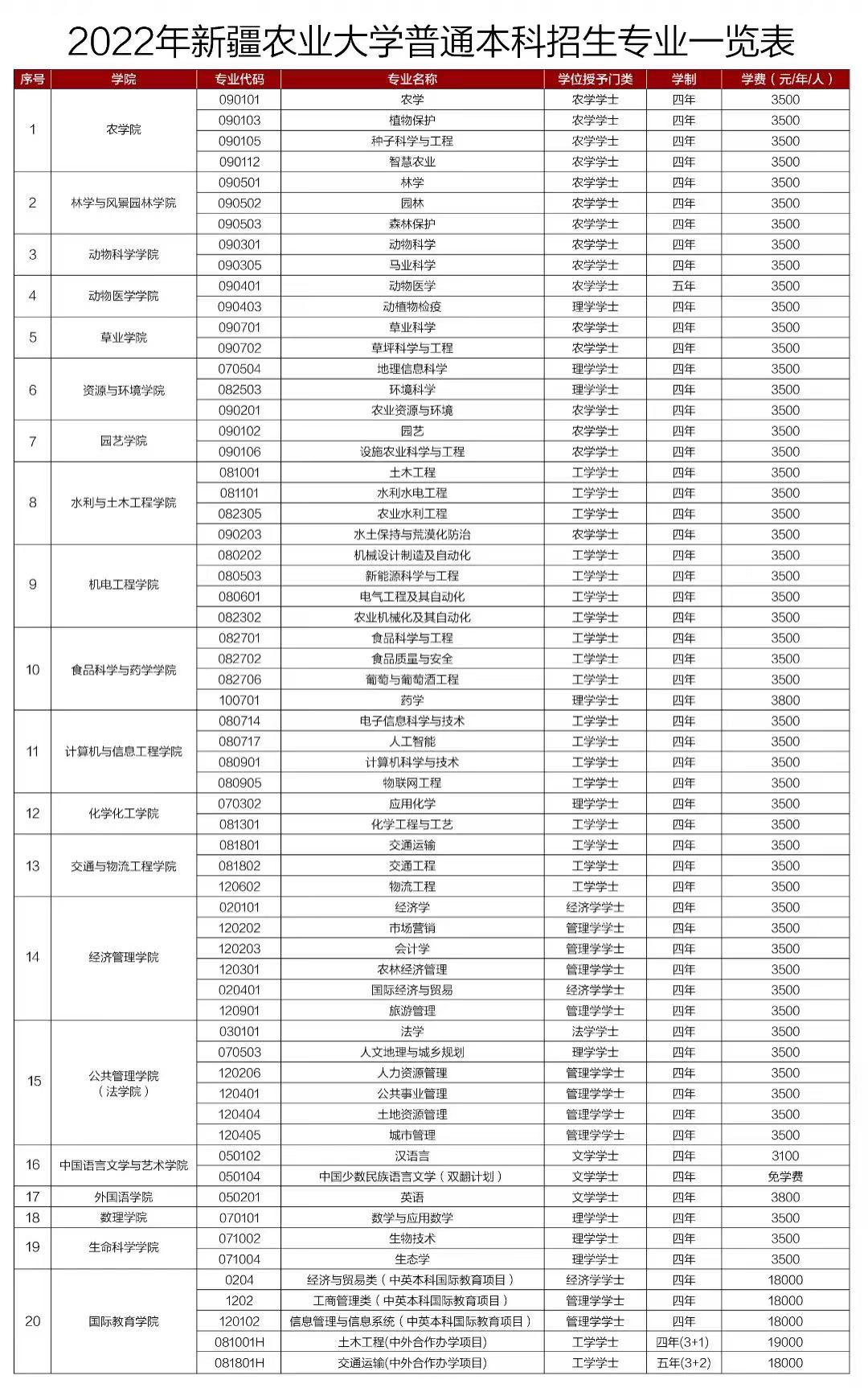 2022新疆农业大学学费:英语、药学专业为3800元/年,汉语言专业3100元/年,其他本科专业为3500元/年,中英本科国际教育项目(经济与贸易类、工商管理类、管理科学与工程类专业)为18000元/年,中外合作办学项目交通运输专业为国内学习阶段18000元/年,中外合作办学项目土木工程专业为国内学习阶段19000元/年 。具体各专业收费标准如下,希望对大家有所帮助,如有变动,以学校官方最新消息为准。
